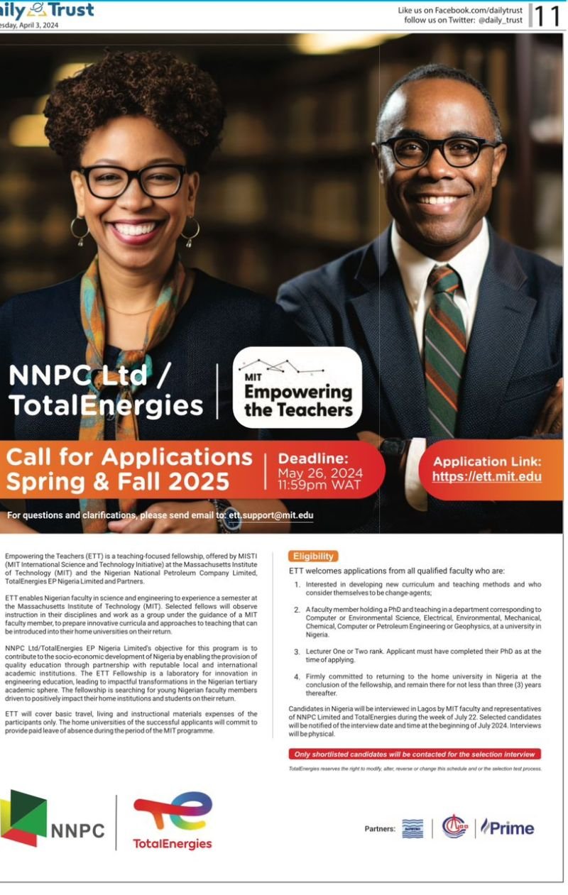 Applications are now open for the MIT-Empowering the Teachers (MIT-ETT) Programme. The MIT-Empowering the Teachers Program (MIT-ETT) is a semester long fellowship accepting engineering professors who are currently teaching at local universities in Nigeria and who recently completed their Ph.D.