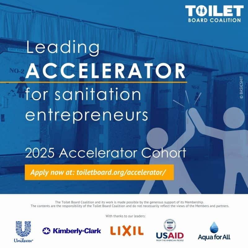 Application is now open for Toilet Board Coalition Accelerator Cohort. The Toilet Board Coalition is calling entrepreneurs across Africa, Asia and Latin America to apply to the world’s leading Accelerator for sanitation businesses. Spread the word by sharing the flyer or social media assets found below.